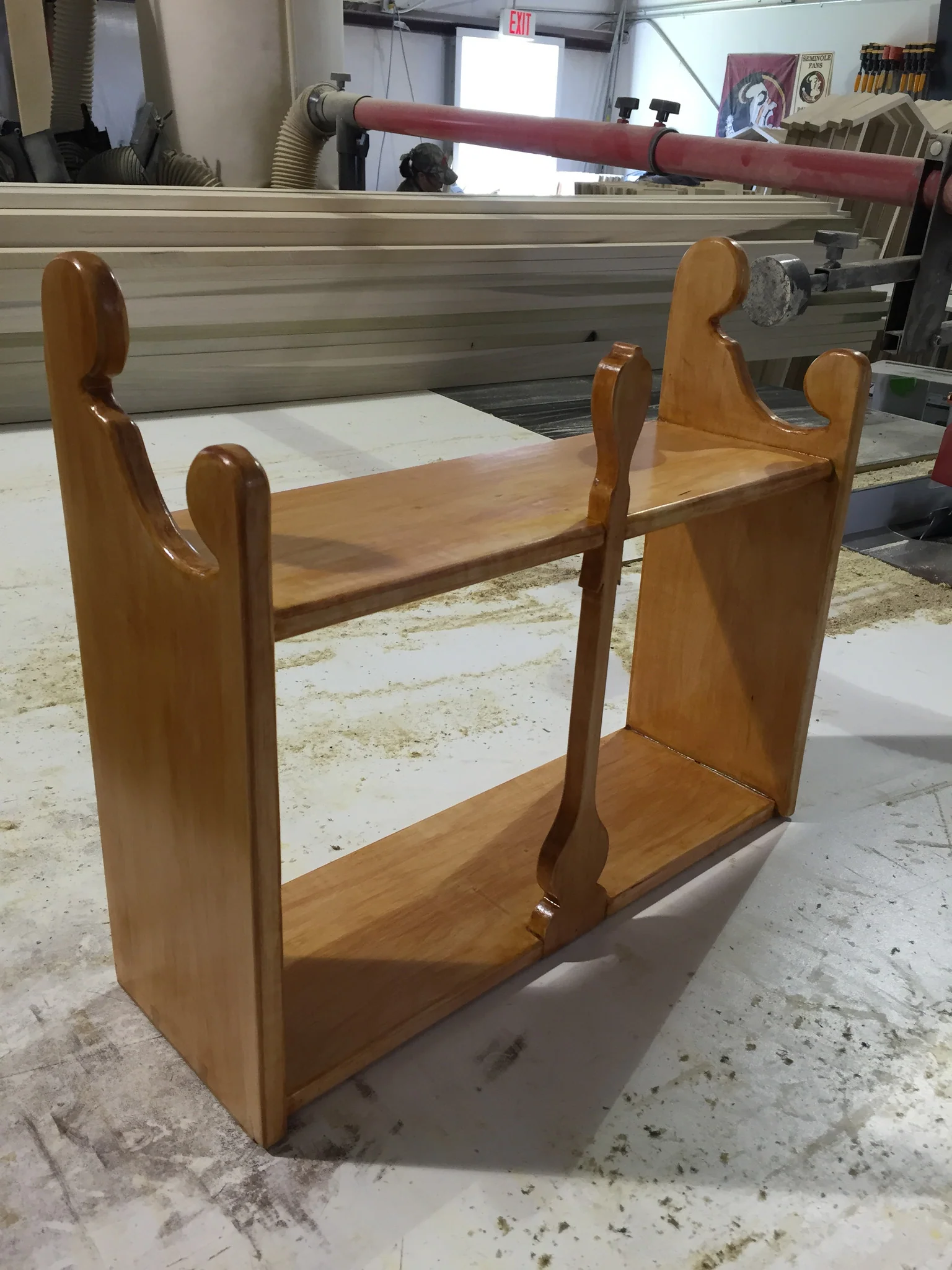 This small hanging bookcase is patterned after a small hanging bookcase found at Eleanor's Val-Kill estate. It is true to the construction methodology of the time, with hidden dovetails for the bottom shelf and a sliding dovetail for the upper shelf. These are not typically made this way today because of the cost, but these features ensure its historical accuracy. Eleanor's version was actually a copy itself, with similar versions appearing in early furniture pattern books used by home craftsmen to make their own furniture when purchasing it was not yet an option enjoyed by many. The example shown is 20X7X14 (LWH). It is handmade from solid maple and is finished in a cherry stain.